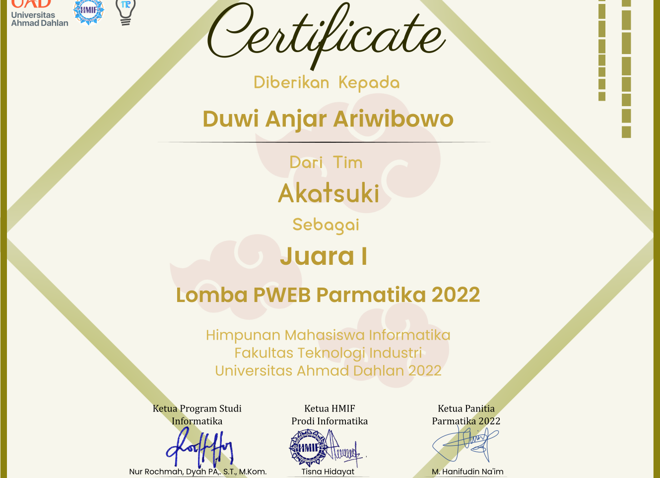 I got this certificate with my friends from a website programming competition held by the informatics student association and we won 1st place in this competition.
